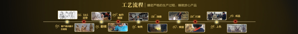 制作一件完美的人物雕塑,最重要的步驟就是制作泥塑模型,然后再用工業硅膠拓印、翻模。所以人物雕塑的姿態、神情生動、莊嚴與否直接影響最終人物雕塑的品質。所以我廠一直對人物泥塑模型的制作格外重視。我廠以雕塑為本,以藝術為根,挾中華文化之傳統,盡顯淋漓盡致。我們本著大膽創新、勇于突破的精神,以追求卓越為導向,堅持寧缺勿濫為原則,并可依照您提供的要求,為您量身設計制作。我廠人才濟濟,有智慧嚴謹的管理班子,有專業技術精湛的人物雕塑制作人才和專業的施工隊伍。他們不僅具深厚的文化藝術底蘊,更汲取當代雕塑精華,博采眾家之長,作品既有嚴肅莊重寫實題材,也有輕松前衛的抽象題材,表現手法上浪漫主義中不乏樸實,現實主義中蘊涵著激情,設計理念深刻詮釋著藝術的精髓,把古典主義和后現代主義完美的融合,將佛像雕塑藝術演繹為力的凝聚、美的體現,讓人們感受到的不僅是一種藝術的浪漫與優雅、粗獷與悲壯、更是豐富的優秀藝術寶藏和文化傳統,讓您在藝術與文化中穿流,在時空中飄蕩,使靈魂在藝術的海洋洗禮。 MORE+